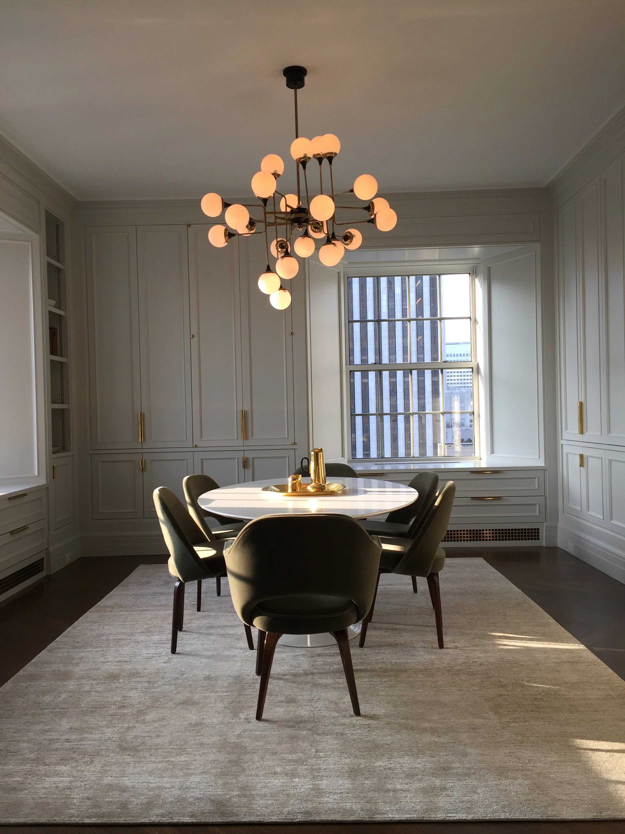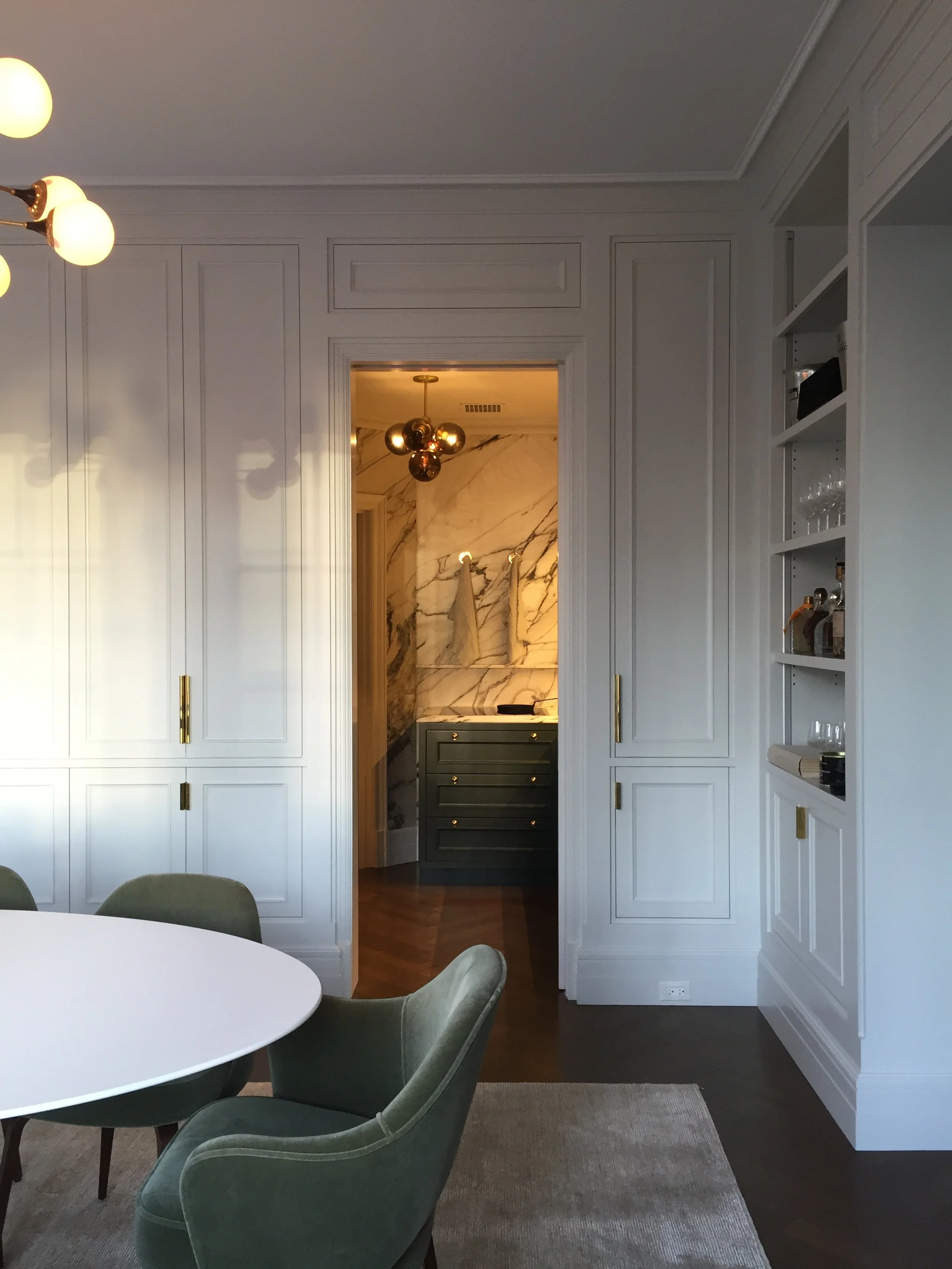 RESIDENTIAL This two bedroom apartment overlooking Central Park was gutted and reconfigured to equal its original elegance. Vintage glass mirrors on the splayed window surrounds reflect and expand the urban views. Custom moldings, cabinetry, and fixtures contribute to a sense of calm high above the bustling city below.